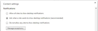 7. Click Manage exceptions... để xem danh sách các site bạn cho phép. Click dấu X bên phải mỗi URLs để không cho chúng gửi thông báo.