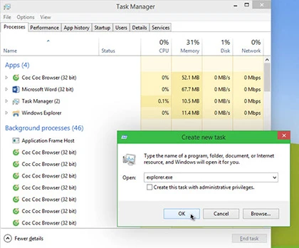 Nếu muốn khởi động lại Windows Explorer, bạn nhấn tổ hợp phím Ctrl + Shift + Esc để mở Task Manager. Truy cập vào menu File > Run new task, sau đó nhập vào explorer.exe > OK là được. Ngoài ra còn một số cách khác để thực hiện việc này là sử dụng Right Click Restart Explorer (http://goo.gl/MP5vSi) để thêm nó vào menu chuột phải.