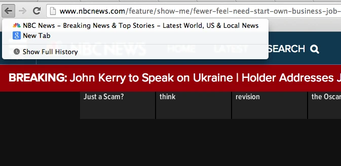 Không cần phải nhấn vào nút quay lại (back) cả chục lần để xem lịch sử duyệt web trước đó. Bạn chỉ cần trỏ con chuột vào nút này rồi bấm và giữ, một loạt các trang vừa truy cập sẽ được hiển thị cùng tùy chọn xem toàn bộ lịch sử.