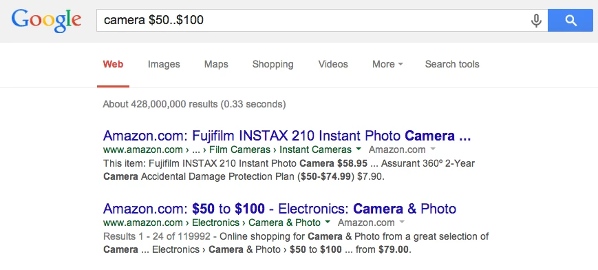 Khi mua sắm, người dùng thường muốn tìm kiếm sản phẩm trong khoảng giá nhất định. Google cho phép làm điều này bằng cách điền hai dấu chấm (..) giữa các con số, ví dụ, tìm mua máy ảnh có giá từ 50 đến 100 USD, chỉ cần nhập “camera $50..$100".