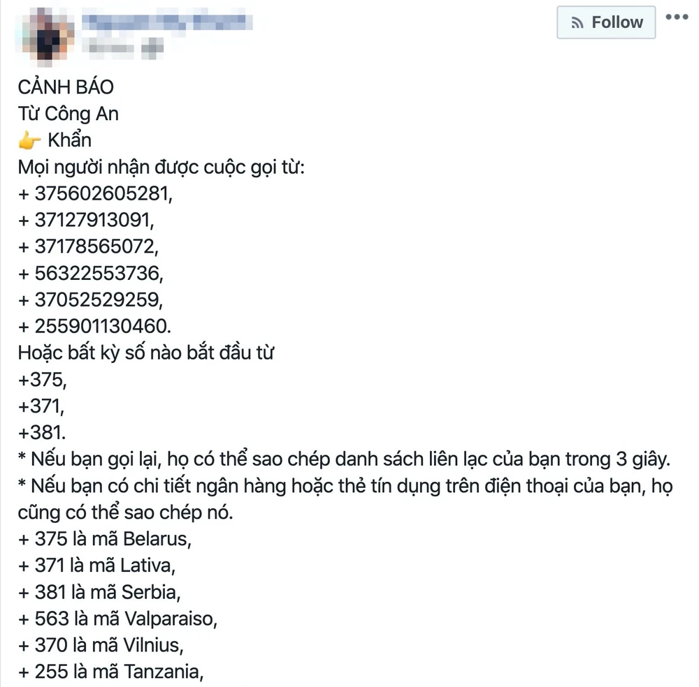 Cụ thể, các bài viết chia sẻ trên Facebook có nội dung như sau: “Khi nhận được cuộc gọi từ các đầu số +375 (Belarus), +371 (Latvia), + 381 (Montenegro & Serbia), +370 (Lithuania), +255 (Tanzania)… Nếu bạn gọi lại, họ có thể sao chép danh bạ, thông tin chi tiết tài khoản ngân hàng, thẻ tín dụng của bạn trong 3 giây. Ngoài ra, khi thao tác #90 hoặc #09, người dùng sẽ bị kẻ gian truy cập vào thẻ SIM và bị trừ tiền trong tài khoản điện thoại”.