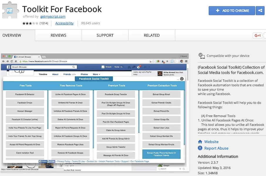 Cài đặt tiện ích Toolkit for Facebook. Ảnh: MH