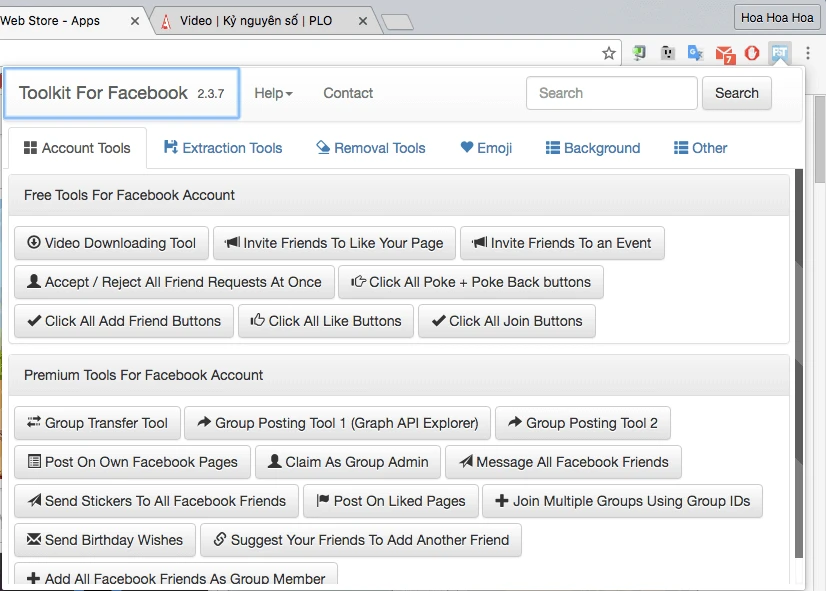 - Bước 3: Tiện ích Toolkit for Facebook cung cấp khá nhiều tùy chọn mở rộng như Video Downloading Tool (tải video Facebook), Invite Friends To Like Your Page (mời bạn bè nhấn Like các trang của bạn), Accept/ Reject All Friend Requests At Once (chấp nhận/từ chối mọi yêu cầu kết bạn)…