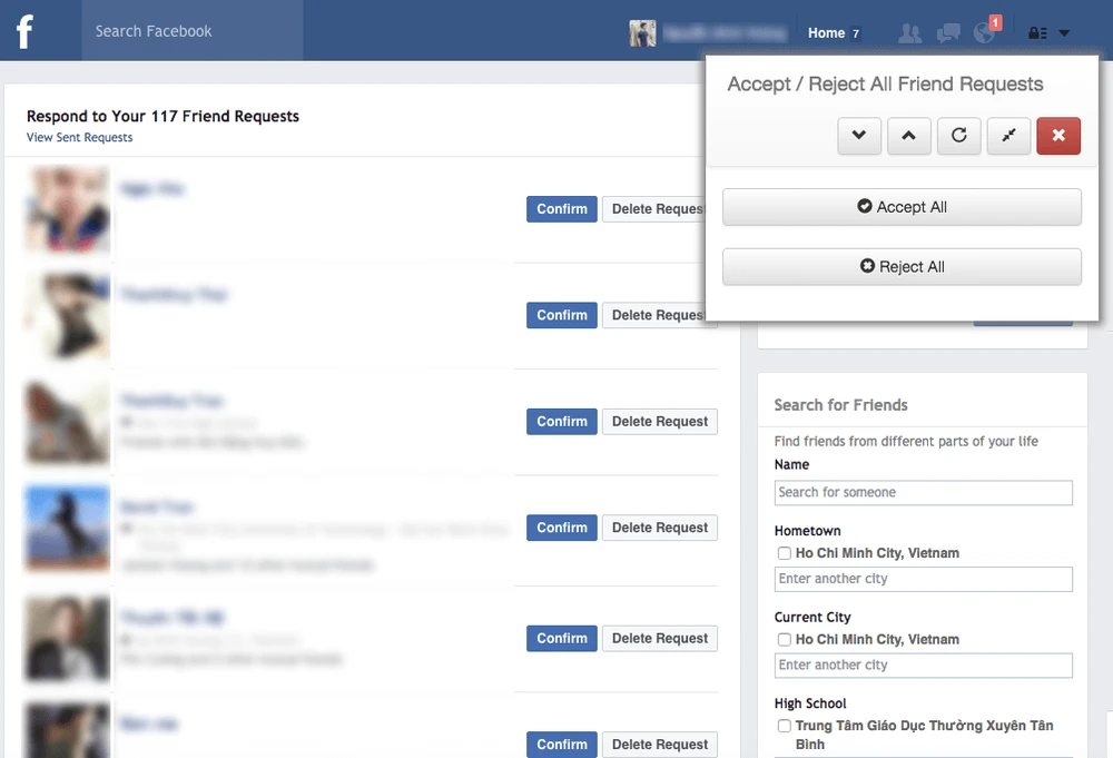 - Bước 4: Để sử dụng được tiện ích Toolkit for Facebook, bạn hãy truy cập vào trang Facebook cá nhân. Ví dụ, nếu muốn chấp nhận toàn bộ yêu cầu kết bạn, người dùng chỉ cần bấm vào mục bạn bè đang chờ và chọn See all.