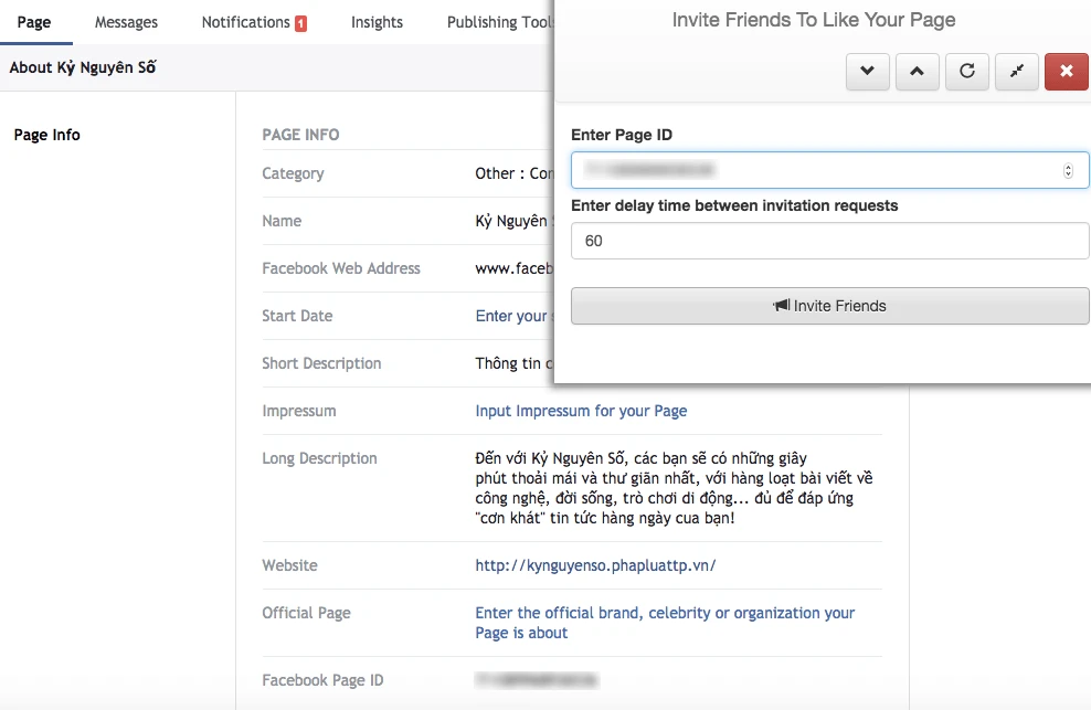 - Bước 6: Tương tự như vậy, bạn có thể mời tất cả bạn bè Like các fanpage của mình bằng cách chọn Invite Friends To Like Your Page, nhập vào ID của trang (có thể xem lại Facebook Page ID trong phần About), lựa chọn khoảng thời gian cách quãng giữa các lời mời, cuối cùng nhấn Invite Friends.