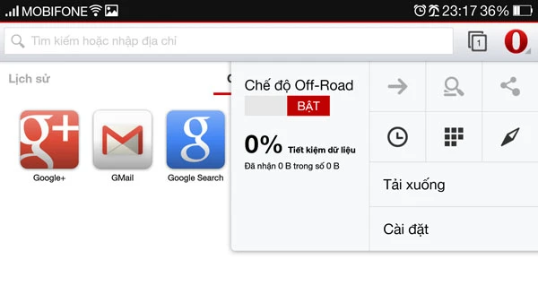 Để kích hoạt tính năng tiết kiệm dữ liệu, bạn nhấn vào biểu tượng Opera ở góc phải và chuyển mục Off - Road sang chế độ On. Lưu ý, bạn nên tắt nó khi đang sử dụng Wi-Fi, và bật lên khi dùng mạng di động. Ngoài ra, bạn cũng có thể vào phần cài đặt và thiết lập lại chất lượng hình ảnh khi bật chế độ Off - Road.