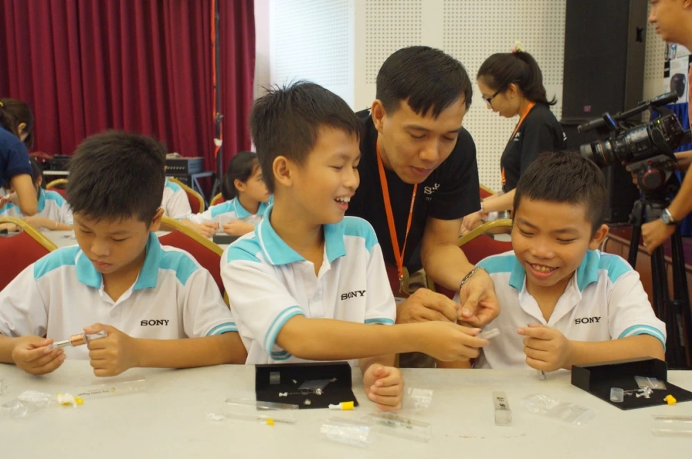 Tham gia vào chương trình lần này, các em được tìm hiểu nguyên lý hoạt động của bộ phát và lưu trữ điện, thành phần cấu tạo nên các thiết bị này, cũng như ý tưởng về một thành phố thông minh mà ở đó mọi người có thể cùng nhau tạo ra điện và sử dụng điện một cách hiệu quả. Với sự hướng dẫn đầy nhiệt huyết của nhóm nhân viên tình nguyện Sony, các em đã từng bước lắp ráp linh kiện bao gồm bảng mạch điện, nam châm, đèn LED, tụ điện, dây đồng thành bộ phát điện hoàn chỉnh. Sau đó, các em có thể dùng sản phẩm mà mình vừa lắp xong để thắp sáng chiếc bóng đèn LED nhỏ xíu được gắn liền trên thiết bị này.