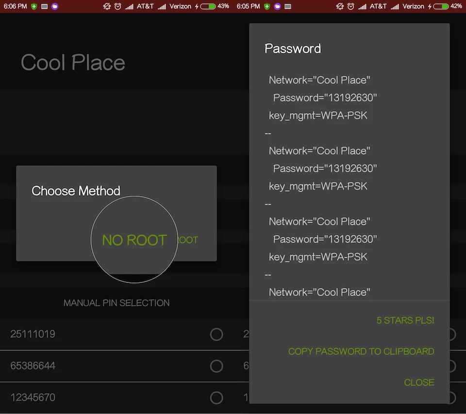 Trong cửa sổ tiếp theo, bạn chọn Connect Automatic PIN > No Root (nếu máy đã root thì nên chọn root). Chờ một lát để ứng dụng gửi tín hiệu đến router bằng một vài mã PIN có sẵn, nếu thành công ngay lập tức nó sẽ hiển thị mật khẩu Wi-Fi mà bạn đang kết nối. Nếu gặp thông báo lỗi, bạn hãy thử phương thức Custom PIN và nhập vào mã PIN (dãy gồm tám con số) được in ở mặt sau hoặc mặt dưới router.