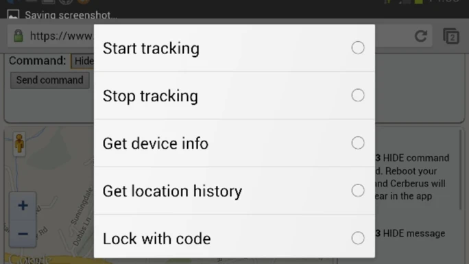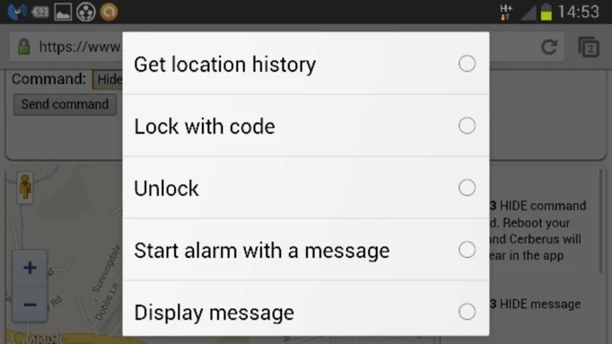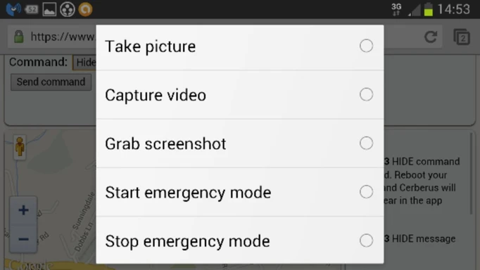 Tại mục Command, người dùng sẽ có được rất nhiều lựa chọn để điều khiển hoặc theo dõi chiếc điện thoại từ xa đơn cử như xác định vị trí và theo dõi (Start tracking), khóa điện thoại bằng mật khẩu (Lock with code), phát báo động ngay cả khi điện thoại đang ở chế độ im lặng (Start emergency mode), chụp ảnh kẻ trộm (Take picture), thậm chí là quay video kẻ trộm (Capture video), xem lịch sử vị trí (Get location history) để biết rằng người này đã đi đến những đâu trong thời gian trước đó, xóa bộ nhớ trong thiết bị (Wipe device memory) và thẻ SD (Wipe SD card), ẩn ứng dụng Cerberus để tránh bị phát hiện (Hide from app drawer), ghi lại âm thanh từ micro (Record audio), nhận thông tin về mạng di động và Wi-Fi mà thiết bị đang kết nối, hoặc các điểm Wi-Fi gần đó và nhiều hơn thế nữa.