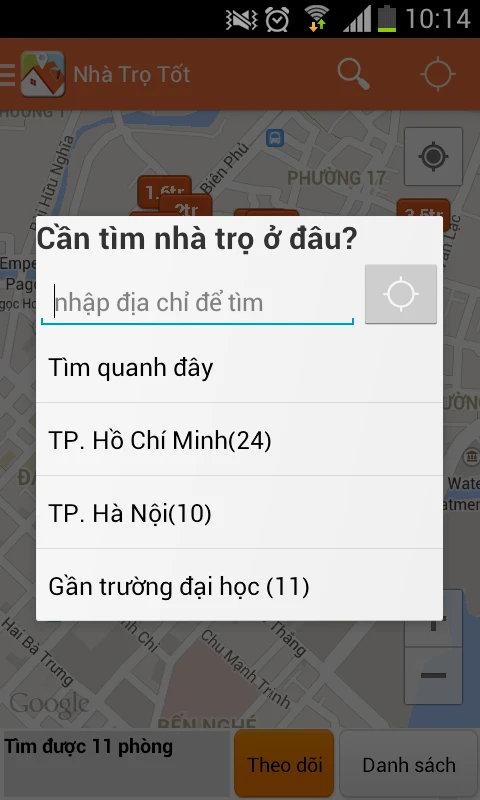 Đầu tiên, bạn chạm vào biểu tượng kính lúp rồi nhập vào tên đường, tên khu vực hoặc tên thành phố để bắt đầu tìm kiếm. Lưu ý, hạn chế tìm kiếm theo địa chỉ cố định vì kết quả trả về rất ít. Bên cạnh đó, NTT cũng sẽ tự động liệt kê một số khu vực mà người dùng hay truy vấn, cũng như chỗ trọ xung quanh các trường đại học/cao đẳng.