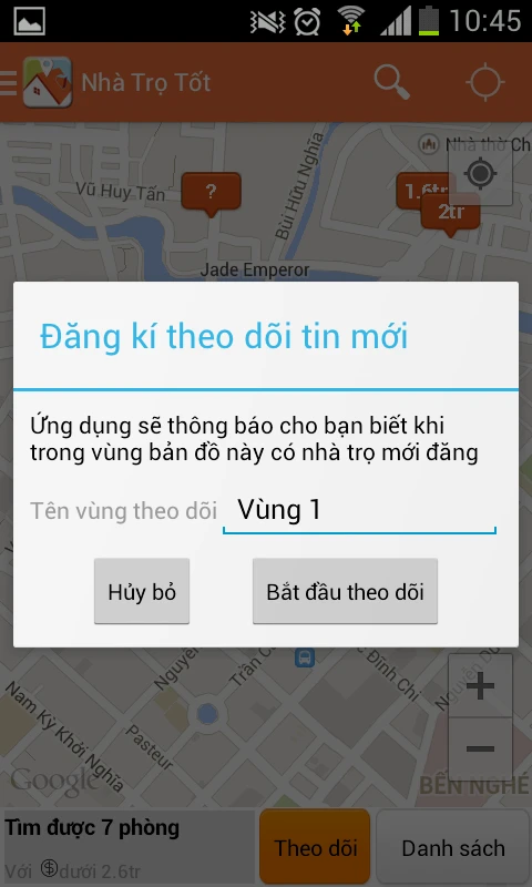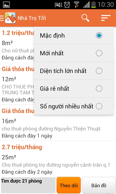 Bên cạnh chức năng tìm kiếm nhà trọ thì NTT còn cung cấp cho bạn một số bộ lọc để tìm chỗ ở dựa trên các tiêu chí giá cả thấp nhất, diện tích và thời gian đăng tin. Để truy cập vào tính năng này, bạn chạm vào biểu tượng ngôi nhà ở góc trên bên trái là được.