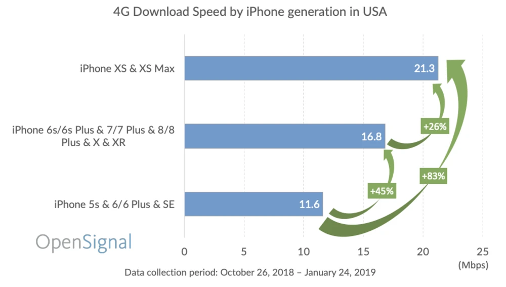 Theo đó, những model đời cũ như iPhone 5S, 6 hoặc 6 Plus có tốc độ kết nối chỉ bằng một nửa so với iPhone XS và XS Max.