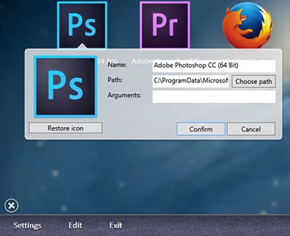 Bên cạnh đó, bạn có thể dễ dàng thay đổi được biểu tượng hoặc đường dẫn của các ứng dụng chỉ với vài cú nhấp chuột. Đầu tiên, bạn nhấn vào nút Edit rồi chọn biểu tượng cần thay đổi thông tin là được, cuối cùng nhấn Confirm để xác nhận lại việc này.