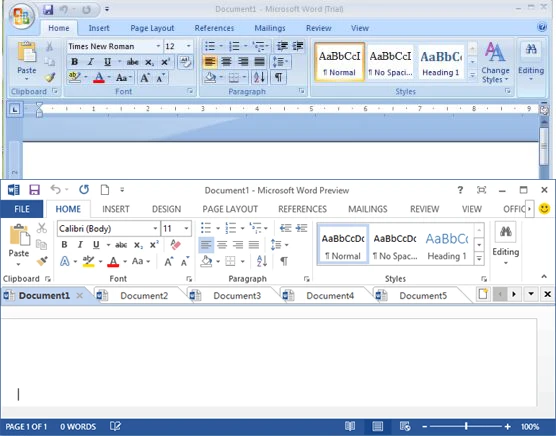 Tôi thật sự rất “quan ngại” về việc “bày bừa” tất tần tật mọi thứ lên thanh ribbon ở phiên bản Office 2007. Khi muốn sử dụng một chức năng nào đó, tôi thường mất rất nhiều thời gian để tìm kiếm, một phần vì bản 2007 là bản đầu tiên MS sử dụng giao diện Ribbon, một phần vì phong cách thiết kế mô phỏng (skeuomorphic) đang thịnh hành tại thời điểm đó, nên thường thì tôi sẽ dùng…. phiên bản 2003 để soạn thảo văn bản đó luôn cho nhanh. Đến với Word 2013, Microsoft lần đầu tiên mang phong cách thiết kế metro lên giao diện office nên cũng không thể tránh khỏi sự “tương đồng nửa mùa” giữa giao diện Office “phẳng” và giao diện office “không phẳng”, tin tôi đi, bạn có thể dễ dàng nhìn vào bức ảnh bên dưới và nói rằng Microsoft chỉ mang đến “bình mới rượu cũ” mà thôi.