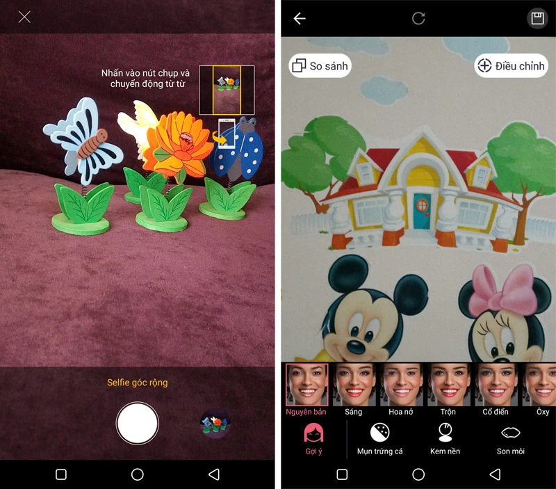 Chụp ảnh tự sướng góc rộng bằng cách ghép ba tấm: Người dùng chỉ cần chọn tính năng chụp góc rộng, nhấn chụp và xoay camera qua trái hoặc qua phải thì máy sẽ tự động ghép ba tấm ảnh lại thành một, tạo nên một góc chụp rộng không thua kém gì những smartphone có camera kép. Tuy nhiên, tính năng này đòi hỏi người dùng phải tập luyện xoay hình thật khớp theo hướng dẫn của máy, nếu không camera sẽ ghép hình không chính xác, tạo nên các góc ảnh bị biến dạng.