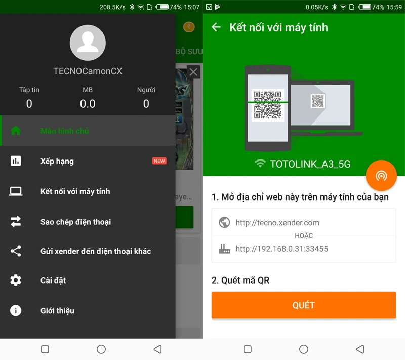 Một tính năng thú vị khác chính là Tecno Camon CX hỗ trợ kết nối chuyển dữ liệu giữa điện thoại và máy tính không cần phải cắm dây cáp USB. Người dùng chỉ cần chọn ứng dụng Xender rồi bấm vào mục kết nối với máy vi tính, khi đó màn hình sẽ hiển thị thông báo đề nghị trên máy tính hoặc laptop gõ địa chỉ trang web tecno.xender.com.