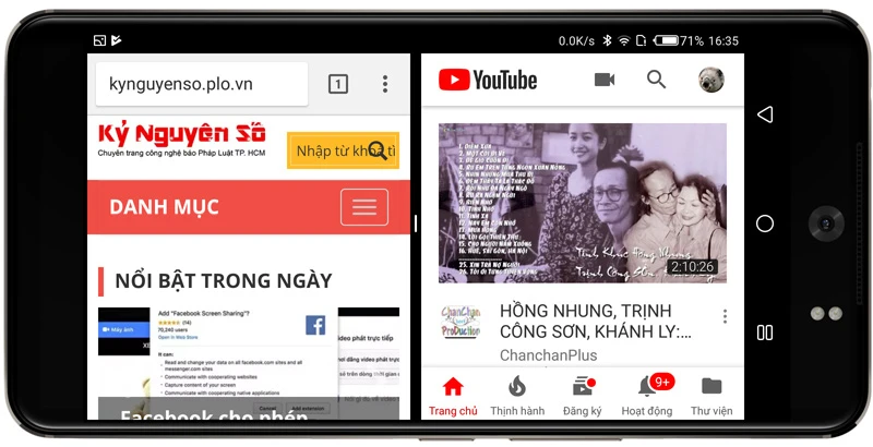 Nhờ sử dụng hệ điều hành HiOs 2.1 tối ưu từ Andorid 7.0 nên máy hỗ trợ tính năng chia sẻ hai màn hình, người dùng chỉ cần chọn phím đa nhiệm góc trái trên màn hình và kéo ứng dụng cần chia sẻ lên phía trên là có thể chia đôi hai màn hình.