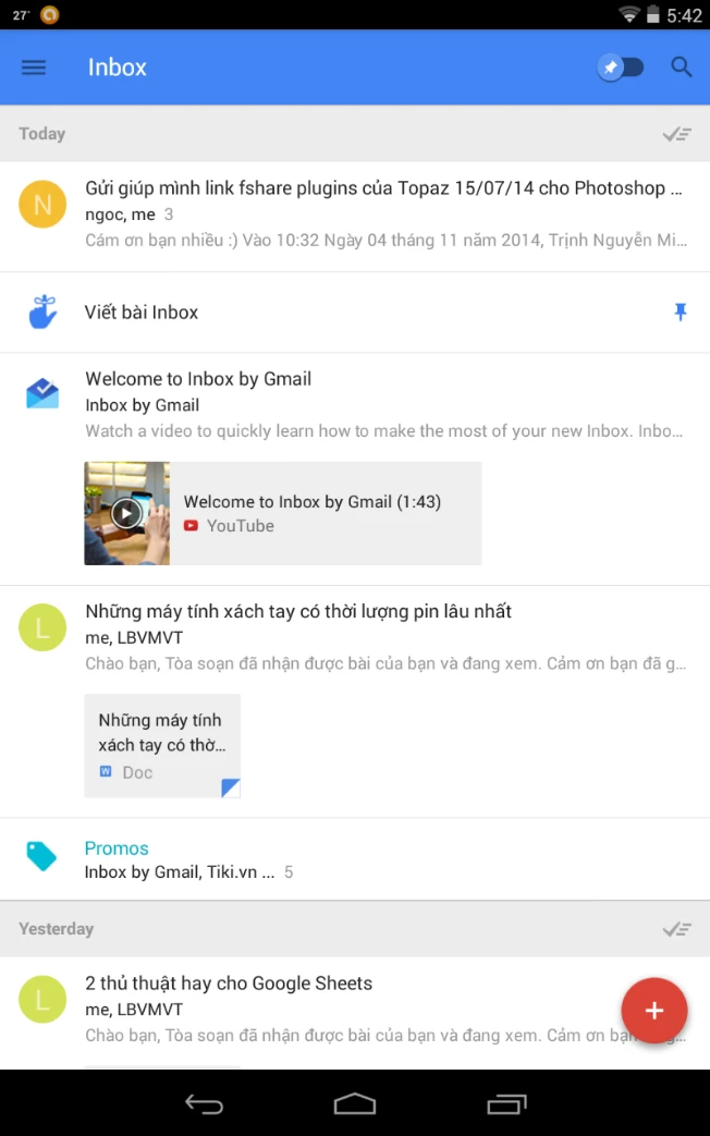Mặc dù tổng quan bài viết này chỉ tập trung trên nền tảng Android, tuy nhiên người dùng iOS đừng quá lo lắng vì giao diện và các thao tác sử dụng đều giống hệt nhau. Đối với phiên bản Inbox trên nền web, mặc dù không thể sử dụng các thao tác cảm ứng nhưng bạn vẫn có thể thực hiện việc này bằng các phím tắt, và nhìn chung là giao diện làm việc vẫn còn khá trống trải.