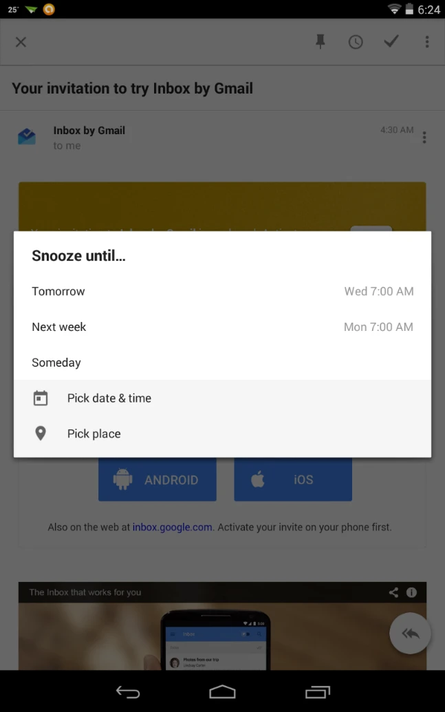 Đôi khi bạn nhận được email nhưng chưa kịp trả lời, hãy bấm vào biểu tượng đồng hồ ở góc phải (Snooze until), cho phép bạn thiết lập thời gian, ngày giờ, địa điểm và đặc biệt hơn cả là dựa trên vị trí. Để khi đến đúng thời hạn, nó sẽ tự động hiển thị email này trở lại và cũng là cách để giữ cho hộp thư luôn được gọn gàng.