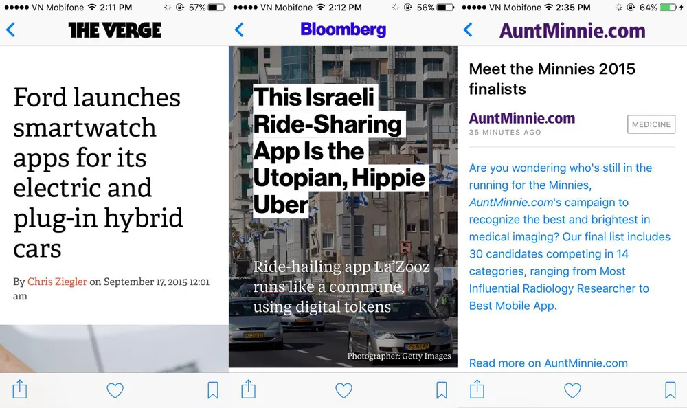 Điểm đặc biệt của ứng dụng News chính là giao diện bài việt riêng biệt, được thiết kế riêng cho từng đầu báo khác nhau. Ví dụ như tờ The New York Times sẽ sở hữu logo đặc trưng của họ, hoặc Bloomberg với ảnh đại diện trong suốt cực kì đẹp mắt ngay đầu bài viết, The Verge với thiết kế trang nhã, đễ đọc ngay cả trên các thiết bị có màn hình bé như iPhone 4s và iPhone 5/5s… Apple đã rất chăm chút cho khâu trình bày bài viết, nên những người có sở thích xem nhiều tạp chí nổi tiếng trên khắp thế giới chắc chắn sẽ không thất vọng khi sử dụng ứng dụng này. Ngay trong buổi giới thiệu về ứng dụng News cách đây vài tháng, Apple đã nói đến việc liên hệ trực tiếp biên tập viên của những trang báo trên và đăng kí giao diện độc quyền của họ trên ứng dụng News, chính vì vậy, rất khó để tìm được một ứng dụng khác có giao diện bắt mắt và độc nhất như trên Apple News.