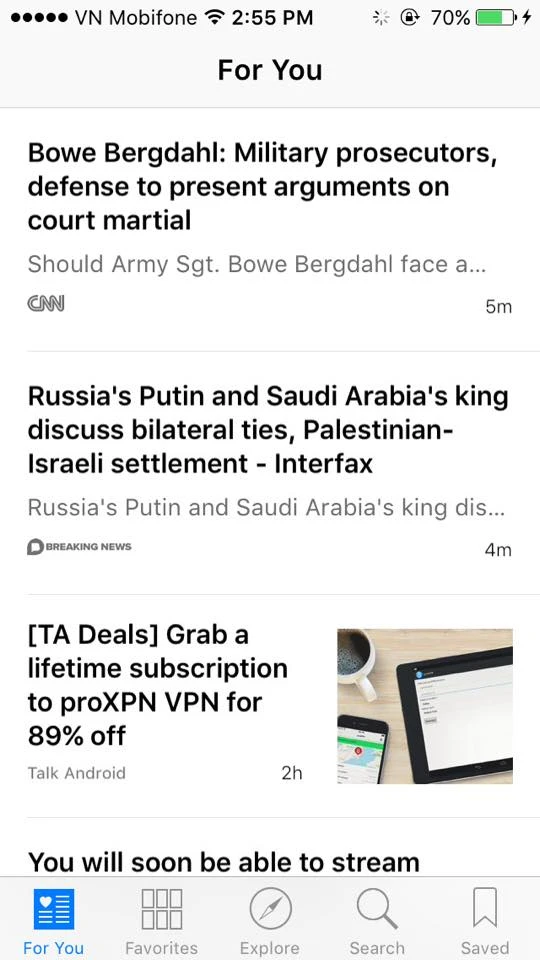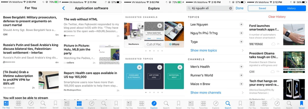 Ngoài trang tin, bạn còn có thể lựa chọn nhiều mục khác, có thể truy cập nhanh tại thanh TabBar bên dưới màn hình, bao gồm: For You (Bản tin của bạn), Favorites (Tin ưa thích), Explore (Khám phá nhiều bản tin hơn nữa), Search (Tìm kiếm thêm nhiều đầu báo khác) , Saved (Tin đã lưu và lịch sử). Mỗi tab là một chức năng riêng biệt và được thiết kế hết sức tỉ mỉ bởi đội ngũ lập trình viên của Apple.