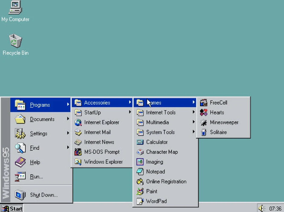 Nếu bạn muốn một cái gì đó mới hơn, hãy thử Windows 95, phiên bản này được giới thiệu khoảng 10 năm sau khi Microsoft ra mắt Windows 1.x. Có thể nói đây chính là phiên bản tiêu chuẩn đầu tiên và nó đã giúp công ty thay đổi hoàn toàn. Những gì bạn có thể làm là chơi game và chạy những chương trình được tích hợp sẵn trên hệ thống. Bên cạnh đó, người dùng có thể trải nghiệm thêm những phiên bản khác của Windows từ 95 cho đến XP tại địa chỉ http://goo.gl/VKRShq.