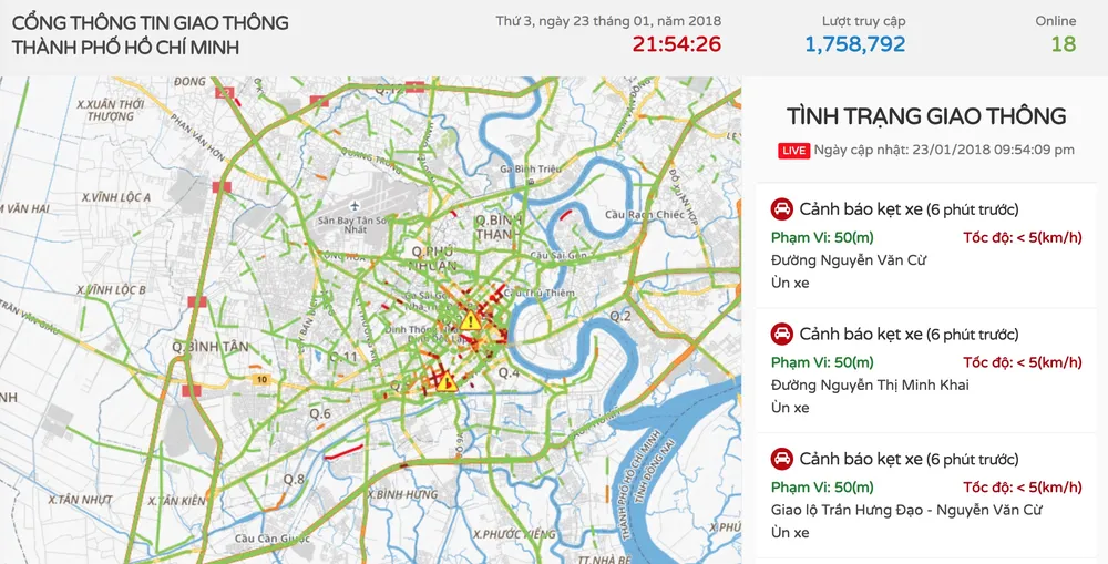Để có cái nhìn tổng quan hơn, bạn hãy chuyển sang phần Bản đồ ở góc phải bên dưới màn hình. Tại đây, ứng dụng sẽ hiển thị bản đồ khu vực TP, những đoạn đường được đánh dấu màu đỏ sậm nghĩa là khu vực đó đang bị ùn tắc nghiêm trọng và màu xanh lá là thông thoáng.