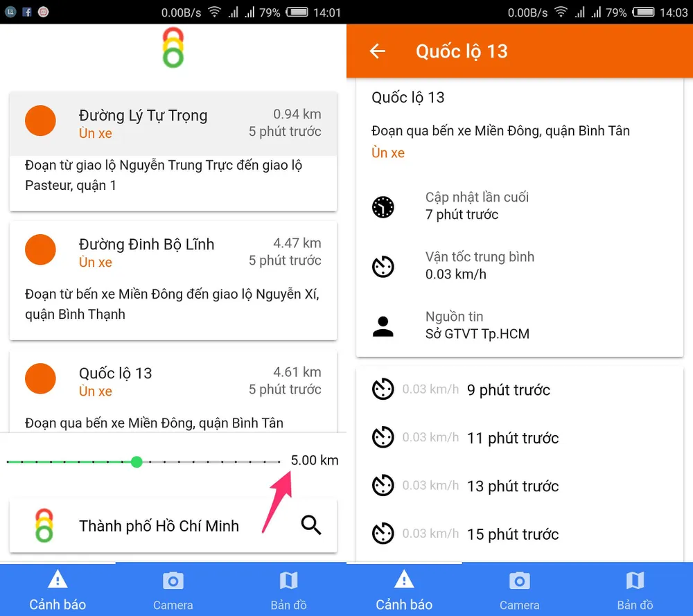 Khi nhấp vào một cảnh báo bất kì, bạn có thể biết được địa điểm ùn tắc, thời gian cập nhật, vận tốc chạy xe trung bình tại khu vực đó… để có thể thay đổi lộ trình di chuyển cho phù hợp.