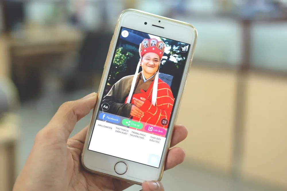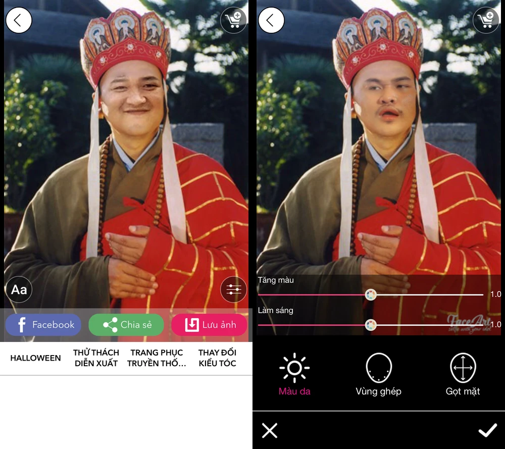 - Bước 4: Người dùng có thể thay đổi màu sắc, chỉnh sửa vị trí khuôn mặt, cằm, mắt... hoặc thêm văn bản thông qua biểu tượng Settings ở góc phải bên dưới tấm ảnh. Cuối cùng, bạn có thể chia sẻ hình ảnh lên Facebook hoặc nhấn Lưu ảnh để tải về máy.