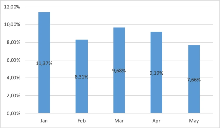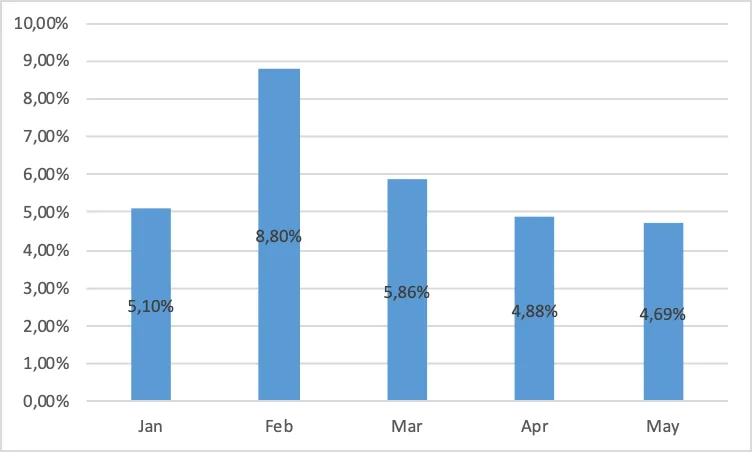 Biểu đồ 1. Mức độ quan tâm của trẻ em Việt Nam đối với trò chơi điện tử từ tháng 1 đến tháng 5-2020.