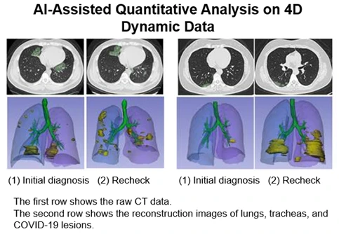 Với công nghệ trí tuệ nhân tạo (AI), dịch vụ có thể nhanh chóng đưa ra kết quả định lượng CT chính xác cho các bác sĩ chẩn đoán hình ảnh và lâm sàng, giảm bớt áp lực kiểm dịch và khối lượng công việc.