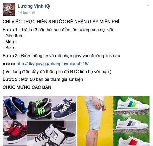 Bên cạnh đó, chiêu lừa tặng giày miễn phí cũng đang có chiều hướng tái diễn trở lại. Để nhận được giày miễn phí, bạn cần trả lời ba câu hỏi về giới tính, màu sắc và size yêu thích, sau đó truy cập vào liên kết do kẻ gian chỉ định để đăng ký thông tin. Tuy nhiên, khi thử nhấp vào thì ngay lập tức nó sẽ chuyển hướng sang một trang web đăng nhập Facebook giả mạo để chiếm đoạt tài khoản.