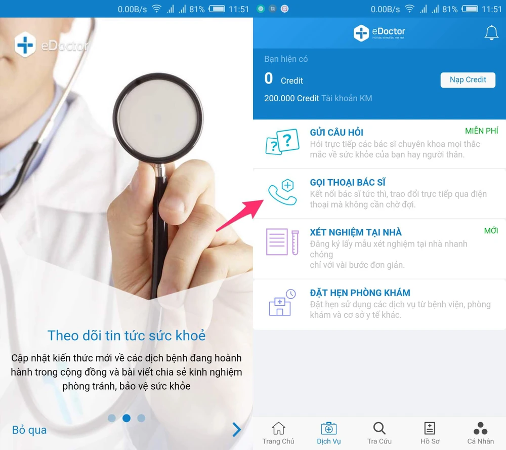 Tại phần Dịch vụ, bạn có thể hỏi trực tiếp các bác sĩ chuyên khoa mọi thắc mắc về sức khỏe (miễn phí), gọi điện cho bác sĩ (có phí), đặt hẹn phòng khám và xét nghiệm tại nhà, giúp tiết kiệm thời gian và công sức đi lại.