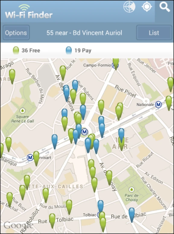 Ngoài những cách trên, người dùng có thể cài đặt thêm ứng dụng Wi-Fi Finder (tương thích với Android và iOS) để tìm thấy hàng triệu điểm truy cập miễn phí ở khắp nơi trên thế giới. Khi đã cài đặt hoàn tất, chương trình sẽ tự động tải về toàn bộ cơ sở dữ liệu, do đó bạn có thể sử dụng ngay cả khi không có kết nối mạng. Wi-Fi Finder sẽ dựa vào vị trí của bạn để hiển thị các điểm truy cập tương ứng.