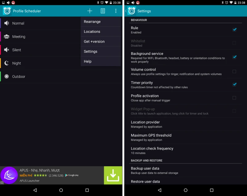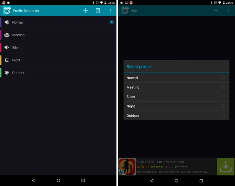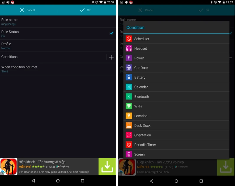 Khi đã hoàn tất, bạn chọn profile đó và chạm vào biểu tượng cuốn sách ở góc phải bên trên để tạo ra các quy tắc (Rule) tương ứng cho nó. Một quy tắc thường bao gồm 5 phần là Rule name (tên quy tắc), Rule Status (trạng thái kích hoạt), Profile (tên profile cần áp dụng quy tắc), Conditions (các điều kiện) và When condition not met (nghĩa là khi các điều kiện trên không xảy ra, thì ứng dụng sẽ chuyển sang một profile mà bạn chỉ định).