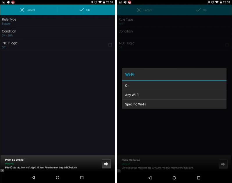 Tuy nhiên, cái mà bạn cần quan tâm đến là Conditions. Ví dụ như bạn muốn điện thoại tự động chuyển sang chế độ rung khi pin còn từ 0 – 30% hay khi kết nối với một mạng Wi-Fi bất kì thì làm như sau. Chạm vào biểu tượng dấu cộng ngay phần Conditions > Battery, sau đó tiếp tục lựa chọn phần Condition nhỏ ở bên trong là 0 – 30% rồi nhấn OK để lưu lại. Tương tự như vậy cho phần kết nối mạng, điện thoại sẽ tự động chuyển sang chế độ rung khi bạn kết nối với một mạng Wi-Fi bất kì (Any Wi-Fi) hay một mạng do người dùng chỉ định (Specific Wi-Fi). Lưu ý, các tùy chọn nhỏ ở bên trong sẽ thay đổi tùy thuộc vào điều kiện mà người dùng lựa chọn.