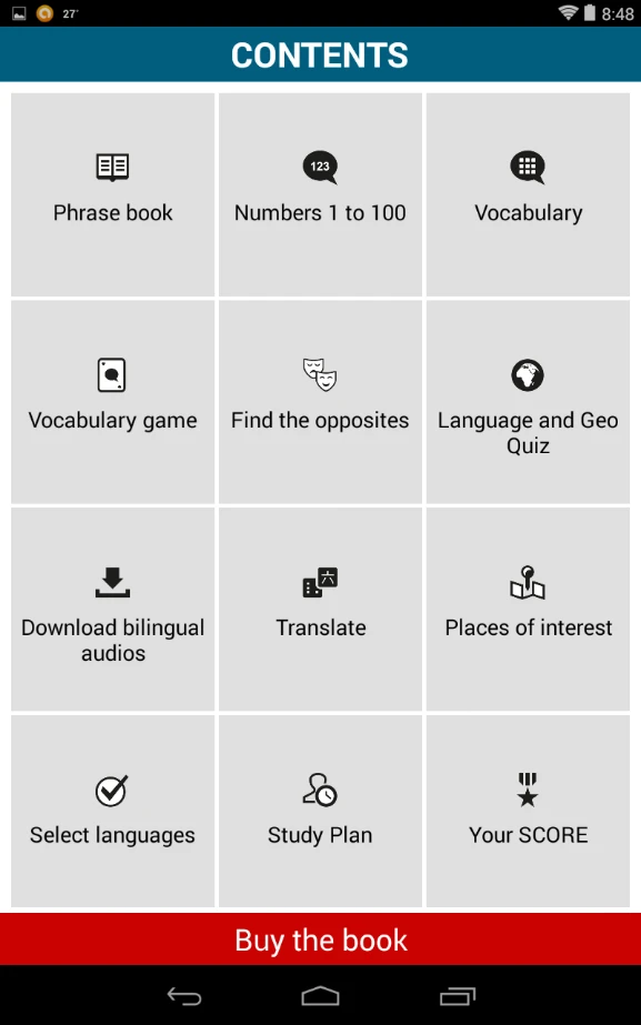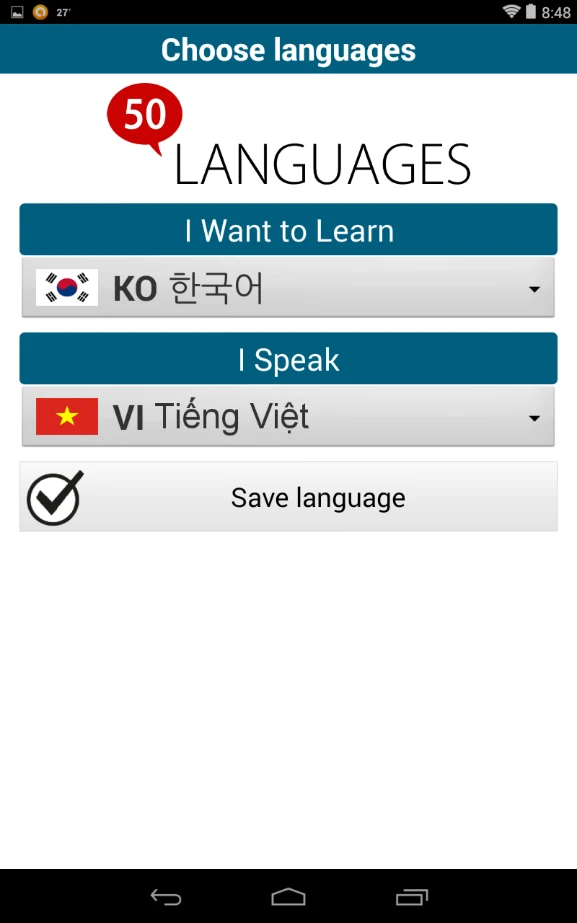 Đầu tiên bạn cần lựa chọn ngôn ngữ muốn học và ngôn ngữ mình đang sử dụng, nếu so với các phần mềm cùng loại thì Learn 50 Languages tỏ ra nhỉnh hơn trong việc hỗ trợ nhiều loại ngôn ngữ khác nhau (bao gồm tiếng Việt). Giao diện chính khá đơn giản với các chức năng đều được phân chia ra thành từng mục riêng biệt như Phrase book (cụm từ), Vocabulary (từ vựng theo nhiều chủ đề), Find the opposites (tìm những từ đối lập),…