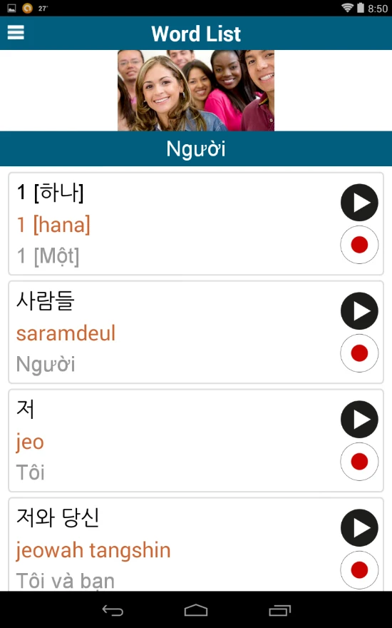 Trong mỗi phần học bao gồm rất nhiều chủ đề quen thuộc nói về con người, nhà cửa, xe cộ, sở thích,…Ở mỗi từ mới, bạn có thể chạm vào nút Play để nghe phát âm với 2 giọng nam và nữ, sau đó bạn cũng có thể lặp lại để xem mức độ chuẩn xác đến đâu thông qua biểu tượng màu đỏ. Ngoài những cách học thông qua các từ vựng cơ bản, thì bạn còn có thể học thêm qua hình ảnh. Ứng dụng sẽ đưa ra một từ nói về cảm xúc và người dùng cần phải chọn đúng vào hình ảnh tương ứng.