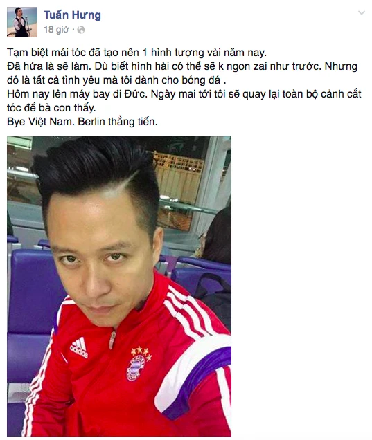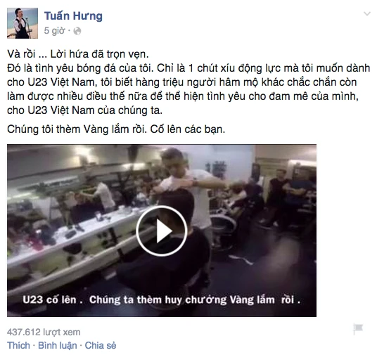 Sau khi qua tới Đức, anh đã lập tức đến tiệm cắt tóc và quay lại cảnh này để thực hiện lời hứa của mình. "Và rồi...Lời hứa đã trọn vẹn. Đó là tình yêu bóng đá của tôi. Chỉ là 1 chút xíu động lực mà tôi muốn dành cho U23 Việt Nam, tôi biết hàng triệu người hâm mộ khác chắc chắn còn làm được nhiều điều thế nữa để thể hiện tình yêu đam mê của mình cho U23 Việt Nam của chúng ta. Chúng tôi thèm Vàng lắm rồi. Cố lên các bạn" - Tuấn Hưng chia sẻ trên Fanpage của mình, đồng thời thể hiện ước muốn Việt Nam vô địch SeaGame lần này.