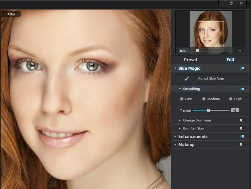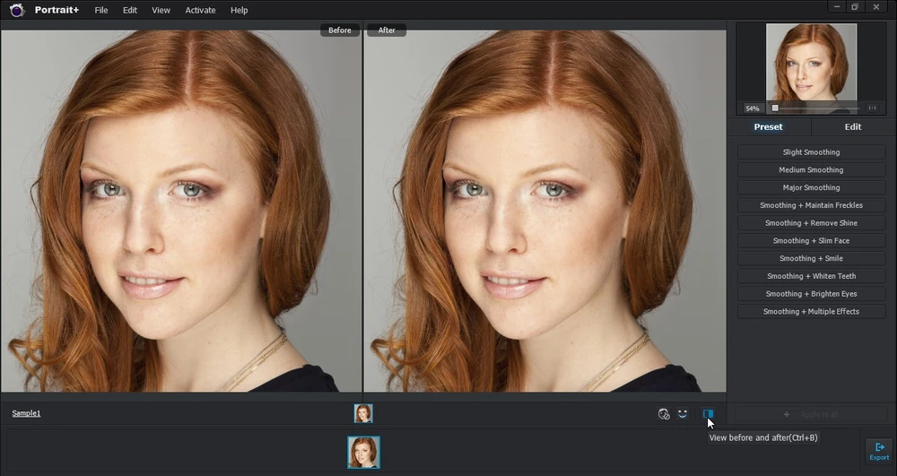 Trước khi thực hiện việc chỉnh sửa, bạn nên nhấp vào biểu tượng cửa sổ ở góc phải bên dưới nhằm chia khung chính ra làm hai phần cho dễ so sánh. Mục Preset bao gồm một số tùy chọn chỉnh sửa đã được cấu hình sẵn như là Slight Smoothing (làm mịn nhẹ), Medium Smoothing (làm mịn vừa phải), Smoothing + Maintain Freckles (làm mịn nhưng vẫn duy trì tàn nhang), Slim Face (làm khuôn mặt gọn hơn), Smile (cười tươi), Whiten Teeth (làm trắng răng),…