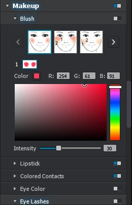 Có lẽ Makeup chính là phần mà các bạn nữ sẽ quan tâm nhiều nhất. Nó bao gồm rất nhiều lựa chọn để thay đổi màu môi (Lipstick), màu trên khuôn mặt khi nó ửng lên (Blush), màu mắt (Eye Color), lông mi (Eye Lashes), dạng lông mày (Shape eyebrow),…Qua đó, bạn vừa có thể “tút” lại hình ảnh của mình trước khi chia sẻ, hoặc sử dụng các công cụ này tìm ra cho mình cách trang điểm sao cho phù hợp nhất.