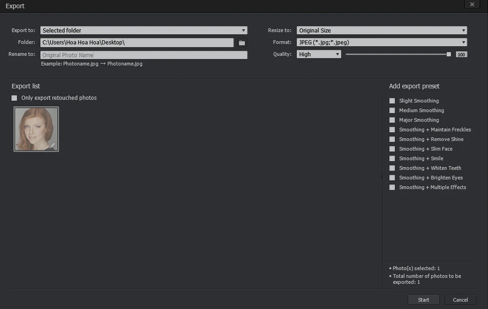 Cuối cùng, sau khi hoàn tất các công đoạn, bạn nhấp vào nút Export. Lựa chọn lại thư mục lưu trữ hoặc thay đổi lại định dạng và chất lượng hình ảnh đầu ra. Các tùy chọn bên phải sẽ cho phép bạn tạo ra cùng một tấm hình, nhưng được áp dụng nhiều hiệu ứng khác nhau. Nếu không thích, bạn chỉ cần nhấn Start để bắt đầu xuất hình với các thiết lập của bạn.