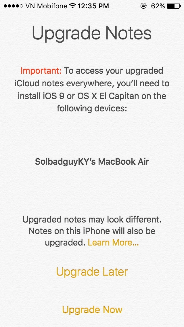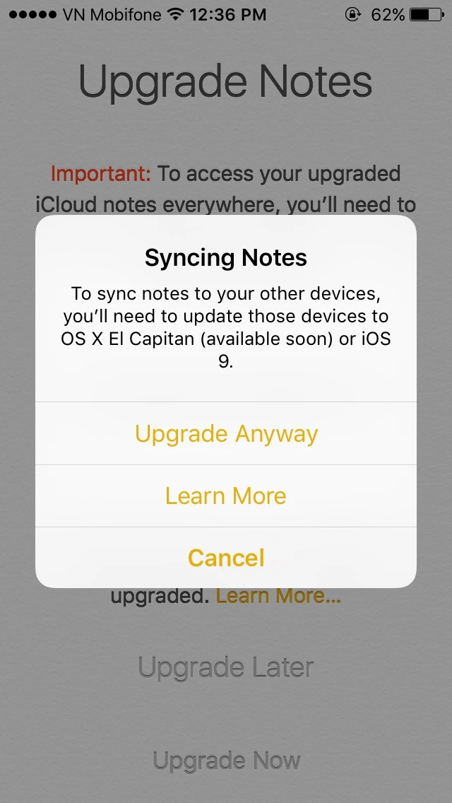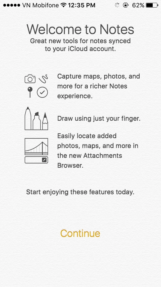Ngay màn hình khởi động của ứng dụng Notes, Apple đã tinh tế "nhắc khéo" về sự khác biệt của Notes "mới" có thể khiến những fan Notes "cũ" cảm thấy bỡ ngỡ! Bởi vì Notes trên iOS 9 sẽ thêm rất nhiều tính năng đặc biệt nên các bạn cần chấp nhận một số yêu cầu của iCloud Notes (nhằm xác nhận bạn sẽ chính thức là "thành viên một nhà" của đại gia đình Notes iOS 9). Sau khi chấp nhận, sẽ có một ít thời gian để thiết bi tải về những file ghi chú được lưu trữ trên tài khoản iCloud trước đó của các bạn.