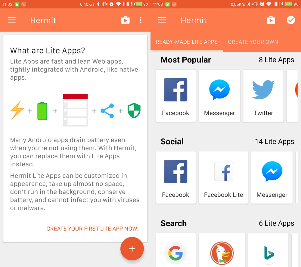 - Bước 2: Về cơ bản, Hermit sẽ cung cấp các phiên bản thu gọn (Lite) của những ứng dụng phổ biến như Facebook, Twitter… đồng thời loại bỏ bớt các chức năng không cần thiết nên mức dung lượng cài đặt chỉ khoảng vài MB so với ứng dụng gốc (50-100 MB). Khi nhấp vào một ứng dụng bất kì, Hermit sẽ tự động tải về và thêm biểu tượng ra màn hình chính.