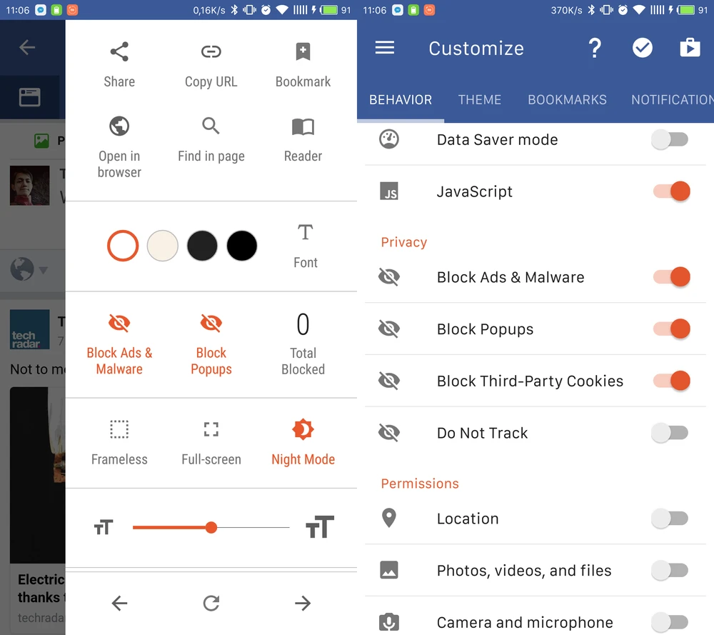 - Bước 3: Những ứng dụng thu gọn sẽ giúp smartphone hoạt động mượt mà hơn, tiết kiệm pin và tăng thêm dung lượng lưu trữ. Bên cạnh đó, khi nhấp vào biểu tượng Settings ở góc trên bên phải, bạn có thể thay đổi màu sắc, kích cỡ phông chữ, chặn quảng cáo và phần mềm độc hại (Block Ads & Malware), chặn popup (Block Popups)… và còn rất nhiều tính năng khác trong phần More Settings.