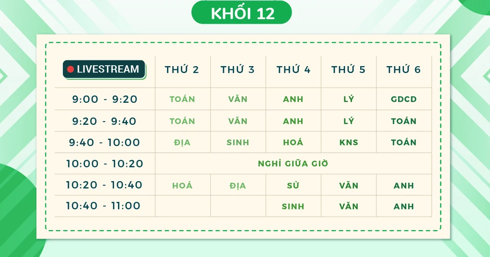 Thời khóa biểu khối 12 của chương trình Học kỳ trực tuyến.