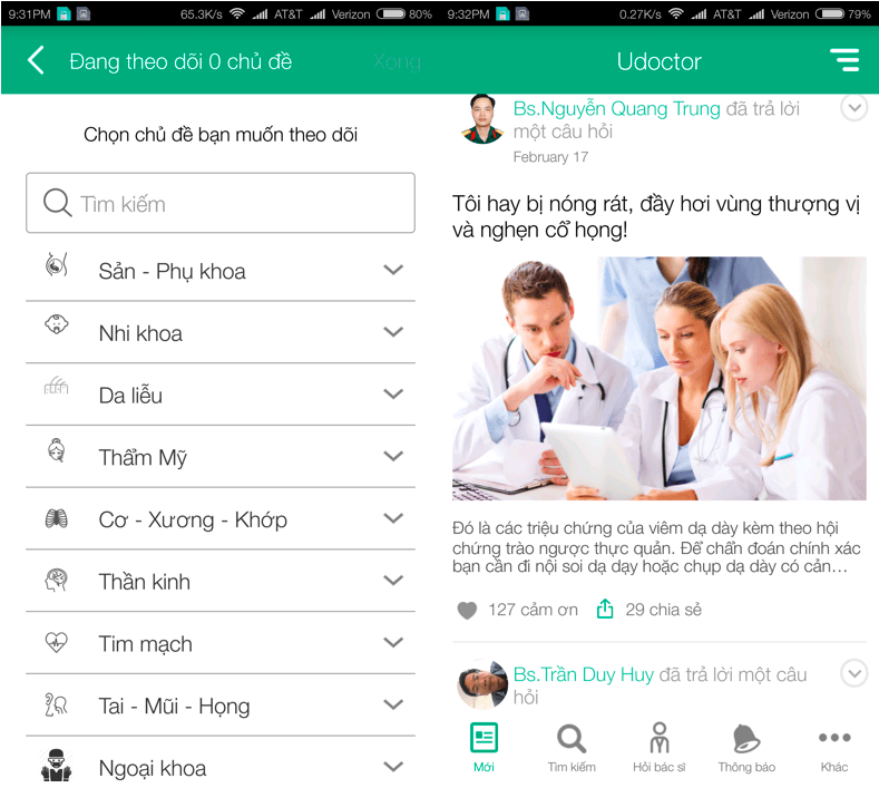 Đặc biệt, Udoctor còn có tính năng lọc tin tức tự động, giúp người dùng tiếp cận với vấn đề sức khỏe mà mình đang quan tâm một cách nhanh chóng nhất. Các vấn đề sức khỏe được phân chia thành nhiều nhóm như Sản - Phụ khoa, Nhi khoa, Da liễu, Thẩm mỹ, Cơ - xương - khớp, Thần kinh, Tim mạch, Tai - mũi - họng,…