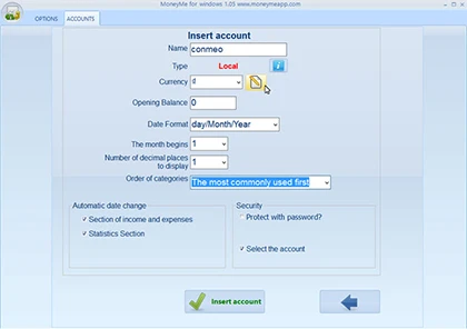 Nhập vào số tiền trung bình bạn kiếm được hàng tháng ở mục Opening Balance, lựa chọn định dạng ngày tháng, rồi nhấn nút insert account để bắt đầu. Để tăng thêm phần bảo mật, bạn nên đánh dấu chọn vào ô Protect with password để thiết lập cho mình một mật khẩu.