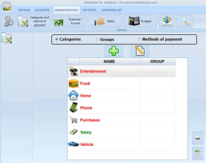 Mục Categories and method of payment đưa chia thành 2 phần nhỏ với Categories là thể loại mua sắm (giải trí, thực phẩm, mua nhà, điện thoại, phương tiện…) và Methods là phương thức chi trả (tiền mặt, thẻ ghi nợ, hay card). Tại đây, bạn dễ dàng thêm vào một thể loại hoặc phương thức mới cho phù hợp với bản thân.
