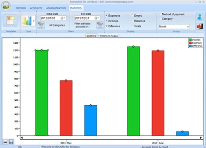 Để so sánh dữ liệu hiện tại và quá khứ, bạn chuyển sang mục Statistic. Nó cho phép bạn so sánh số lượng thu nhập, chi tiêu, tổng số dư và sự khác biệt hàng tháng.